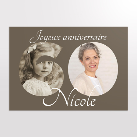 Le modèle “60 ans” séduit par son style sobre, chic et intemporel. La composition repose sur un fond taupe raffiné, qui apporte une atmosphère douce et élégante, idéale pour célébrer un âge symbolique avec goût.