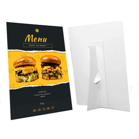 La composition légère et compacte du chevalet PVC en fait un outil de communication attractif et pratique pour promouvoir vos actions promotionnelles. Facilement transportable et installable sur un comptoir ou une table de réunion, il mettra en valeur votre visuel et captera l’attention de votre public lors de salons, expositions ou événements divers.