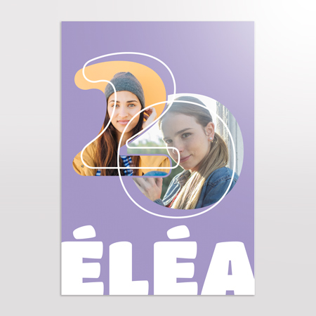 Ce modèle “20 ans” se distingue par un design moderne, lumineux et résolument festif, idéal pour célébrer l’entrée dans une nouvelle décennie. Le chiffre 20, placé au centre de la composition, sert de cadre aux photos grâce à une découpe graphique élégante : chaque chiffre accueille une image différente, créant un effet visuel dynamique et très personnel.