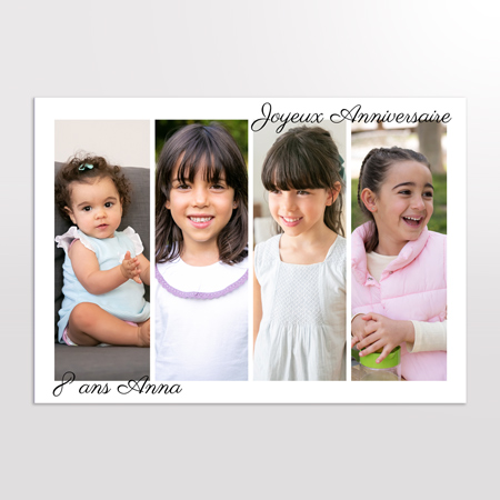 Chaque photo représente une période différente, permettant de montrer l’évolution de l’enfant depuis ses premiers mois jusqu’à l’âge célébré. Ce format linéaire et épuré raconte une histoire en images : un véritable voyage visuel à travers les étapes marquantes de son enfance.