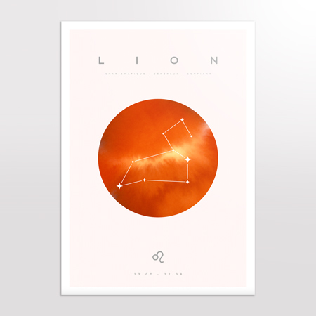 Le modèle Lion exprime toute la force, la fierté et le charisme de ce signe de feu. Cette affiche astrologique se distingue par un design lumineux et affirmé, mettant en avant l’énergie rayonnante et la confiance naturelle du Lion. Les formes audacieuses et les couleurs intenses créent une composition forte, idéale pour une décoration qui ne passe pas inaperçue.