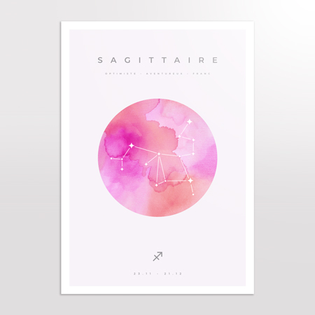 Pensée comme un objet décoratif expressif, l’affiche signe astrologique Sagittaire apporte une touche lumineuse et stimulante à votre intérieur. Son style moderne et aérien s’intègre parfaitement dans un salon, un bureau ou une chambre, et constitue un cadeau symbolique idéal pour celles et ceux qui aiment la liberté et les grands espaces.