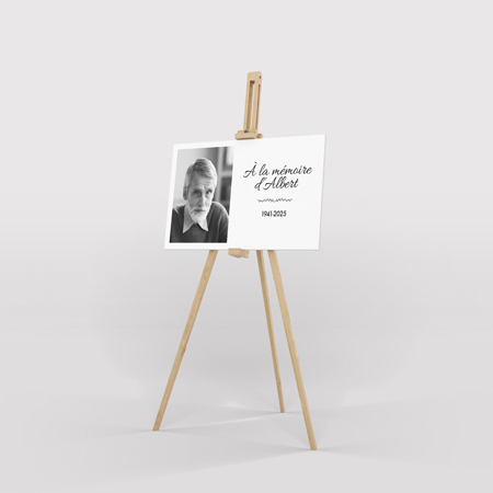 Le panneau commémoratif est une pancarte funéraire personnalisée imprimée sur un support rigide. Placé à l’entrée d’une salle, d’une chapelle ou d’un cimetière, il permet d’accueillir les proches et de transmettre un message de respect et de mémoire. Contrairement aux décorations éphémères comme les fleurs, ce panneau obsèques reste un souvenir durable que la famille peut conserver après la cérémonie. Il reflète l’identité du défunt et peut être conçu dans un style sobre et minimaliste ou plus travaillé avec des visuels, photos et citations.