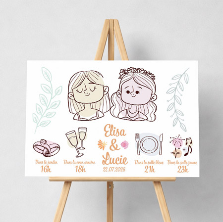 Au-delà de son rôle fonctionnel, la pancarte mariage personnalisée devient un joli souvenir à conserver. Elle peut décorer votre intérieur après le mariage ou être réutilisée pour d’autres événements. Facile à installer sur un chevalet, suspendue ou posée au sol, elle attire le regard et enrichit l’atmosphère de votre journée. Un détail personnalisé qui fait toute la différence dans la mise en scène de votre mariage.