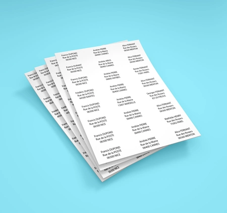 Nous proposons plusieurs formats d’étiquettes publipostage en planches A4, parfaitement compatibles avec la plupart des systèmes de mise sous pli, imprimantes bureautiques et logiciels de publipostage. Deux formats standards sont disponibles : 70 x 35 mm (24 étiquettes par planche A4) et 105 x 35 mm (16 étiquettes par planche A4). Ces dimensions permettent de s’adapter à différents types de contenus et d’envois, tout en assurant une lisibilité optimale. Chaque planche d’étiquettes adhésives est imprimée sur un support de qualité, avec colle permanente pour garantir une bonne tenue sur vos enveloppes, cartons ou pochettes.