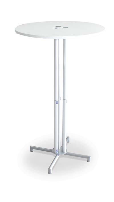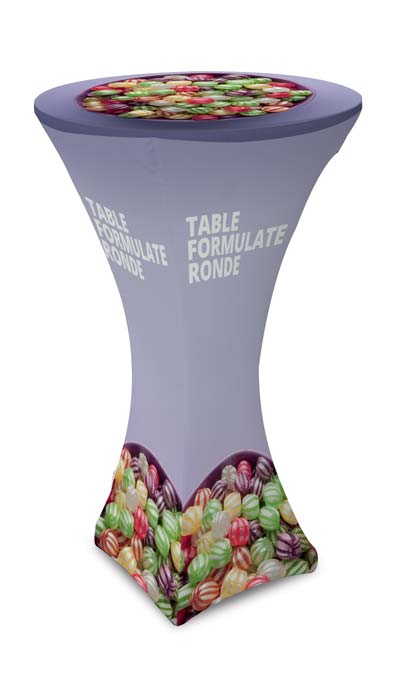 Table haute personnalisée « mange debout »Table personnalisée constituée d’une structure tubulaire en aluminium avec housse en textile imprimé qui épouse parfaitement les contours de la table.