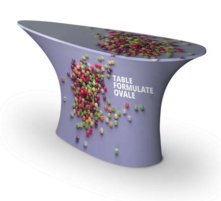 La table ovale en textile est un support de communication idéal pour présenter votre entreprise, association ou société sur un stand. Résistante cette table ovale, elle est idéal pour supporter les animations commerciales lors d’un salon, évènement professionnel ou une foire. Cette solution est propice aux rencontres auprès de vos prospects et de vos clients. Au travers de la personnalisation du textile, ce comptoir est un réel objet publicitaire qui diffusera en un clin d’œil votre identité visuel. Cet objet de présentation comporte assez d’espace pour y déposer des flyers, des cartes de visites, des magazines ou des goodies.Caractéristiques