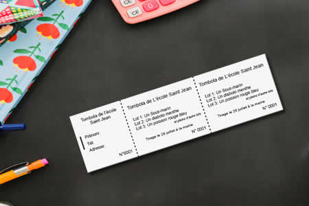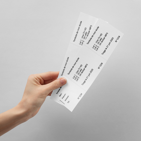 Tickets à souche numérotés imprimé en N&B pour vos concerts, tombolas, kermesses, théâtre, billetterie.